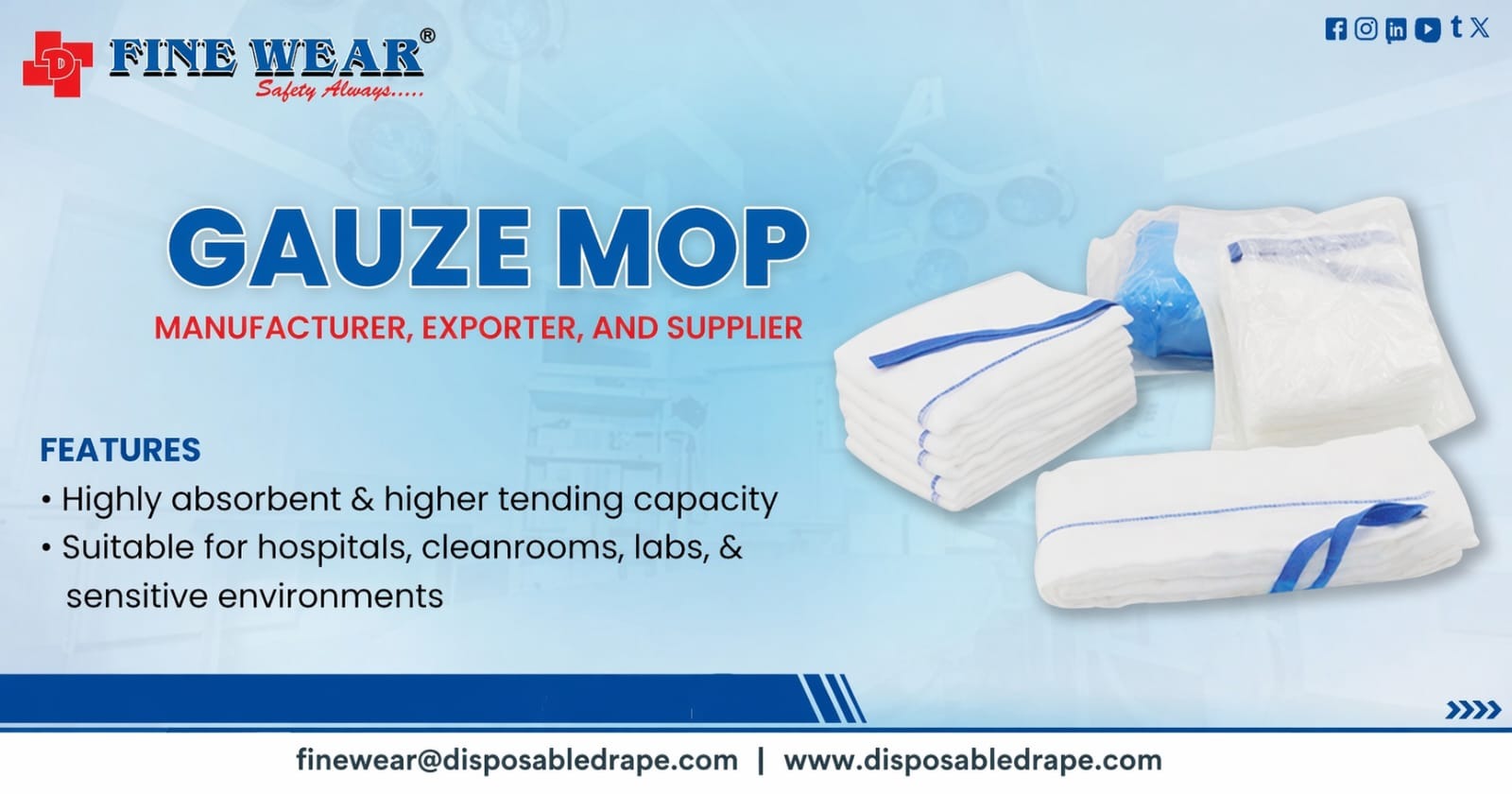 Disposable & Sterile Surgical Drapes, Fenestrated & Adhesive Drapes, Dental & Ophthalmic Drapes, Gauze Swabs, Surgical Cotton Mops, Fine Pads, Fine Dress, Fine Softs & Gamjee Rolls, General Surgery Drape Kits & Accessories.