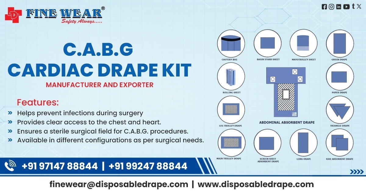 Dhwanit Enterprise, based in Ahmedabad, Gujarat, India, is a trusted manufacturer, exporter, and supplier of high-quality Medical Surgical C.A.B.G. Drape Kit under the brand FINE WEAR, designed specially for critical cardiac procedures.