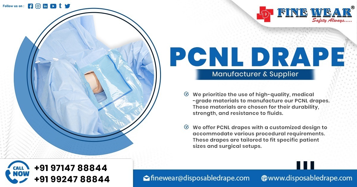Surgical PCNL Drape by Fine Wear is specially designed for percutaneous nephrolithotomy (PCNL) and other urology procedures, ensuring a sterile and safe surgical environment. Manufactured by Dhwanit Enterprise, Ahmedabad, India, these drapes provide excellent fluid control, patient protection, and surgical precision.