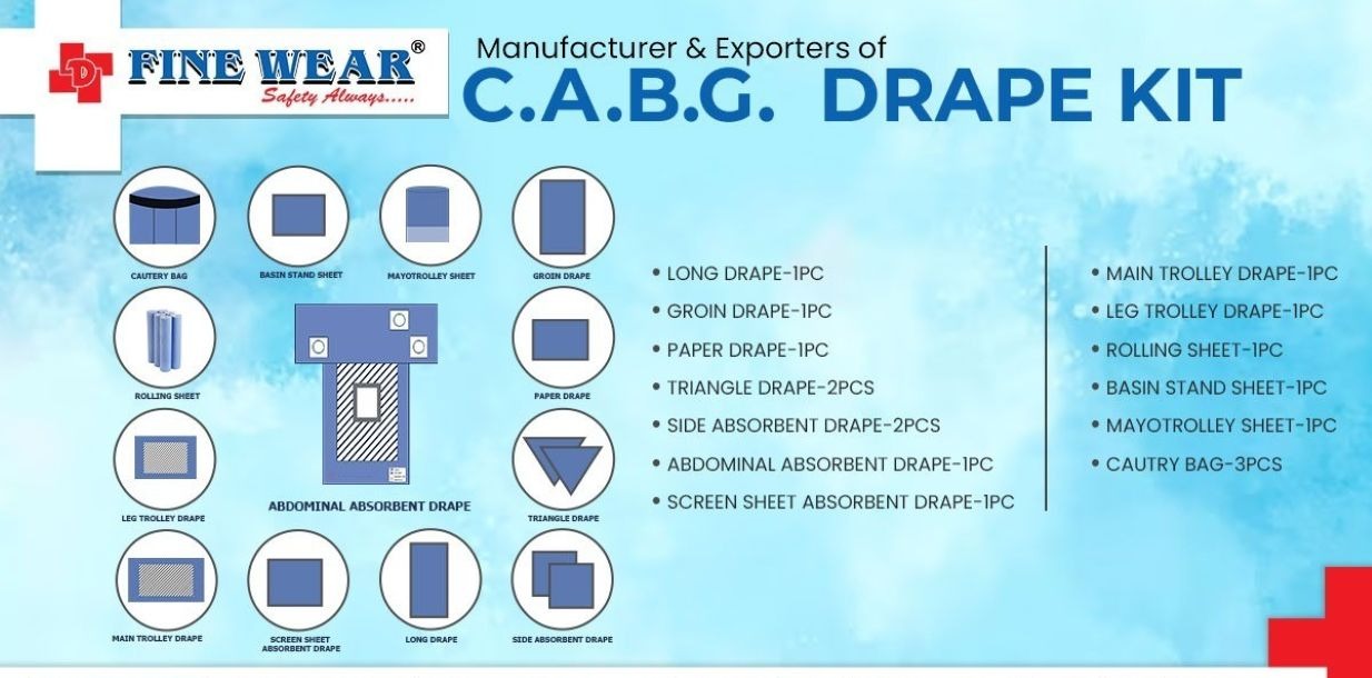 Manufactured in Ahmedabad, Gujarat, India, Dhwanit Enterprise proudly delivers premium-quality SURGICAL C.A.B.G DRAPE KIT under the trusted brand FINE WEARβdesigned for critical cardiac procedures with unmatched reliability.